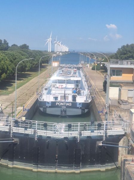 Au fil de la Viarhôna, 1ère pause d’apprentissage technologique : Monsieur Rungette explique un certain nombre d’éléments techniques concernant les éoliennes. Deuxième explication technique : le passage de l’écluse par une péniche.